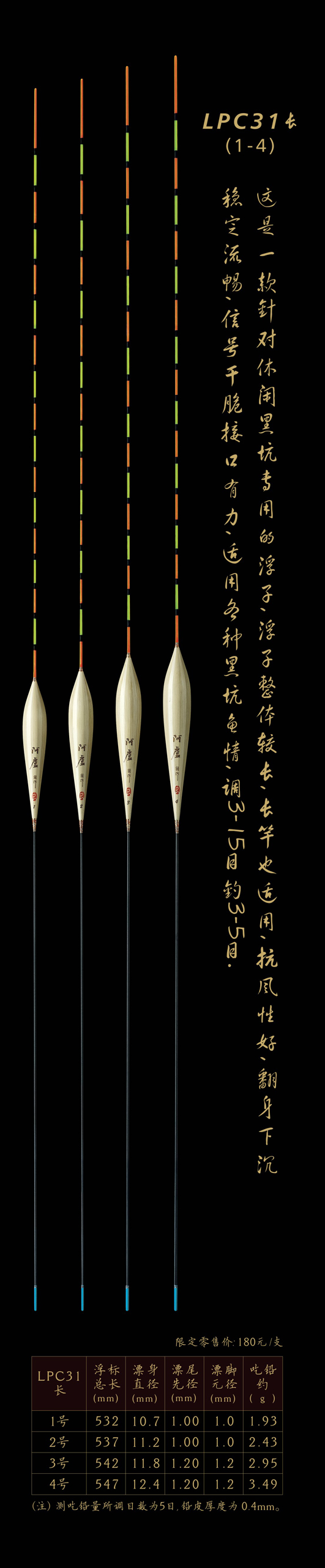 LPC31長:是一款針對(duì)休閑黑坑專用的浮子,浮子整體較長,長竿也適用,抗風(fēng)性好,翻身下沉穩(wěn)定流暢,信號(hào)干脆接口有力,適用各種黑坑魚情,調(diào)3—15目,釣3—5目。