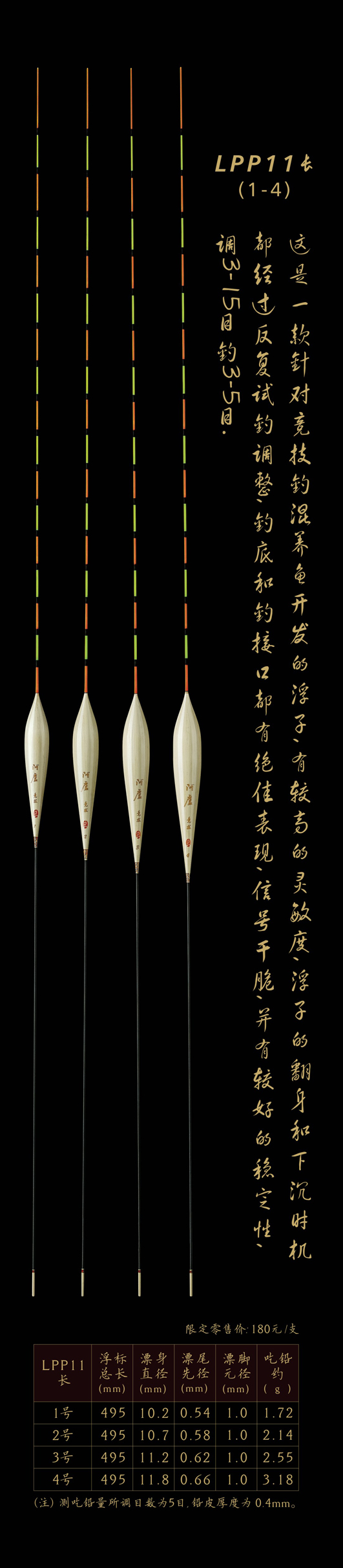 LPP11長:這是一款針對(duì)競(jìng)技釣混養(yǎng)魚開發(fā)的浮子,有較高的靈敏度,浮子的翻身和下沉?xí)r機(jī)都經(jīng)過反復(fù)試釣調(diào)整,釣底釣接口都有絕佳表現(xiàn),信號(hào)干脆,并有較好的穩(wěn)定性,調(diào)3—15目,釣3—5目。