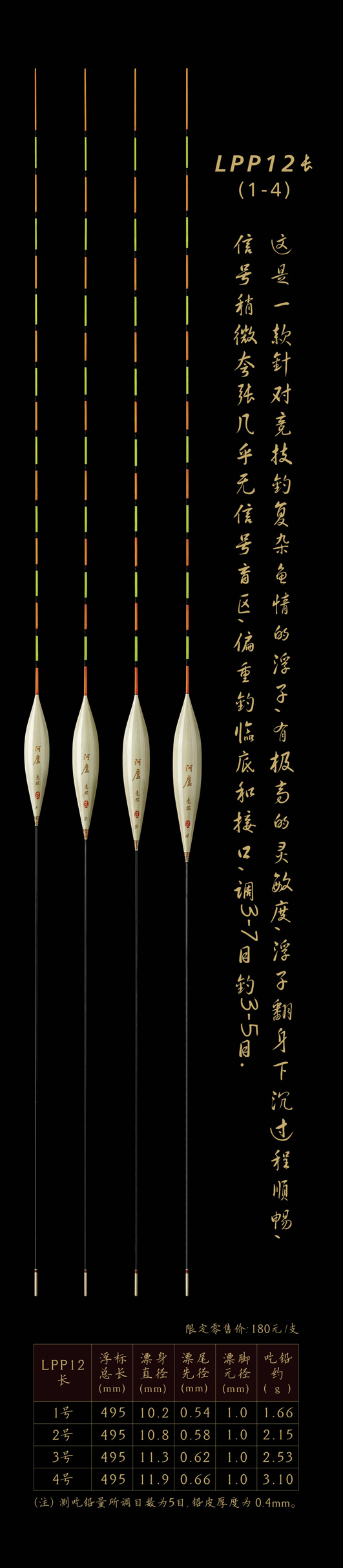 LPP12長:這是一款針對(duì)競(jìng)技釣復(fù)雜魚情的浮子,有極高的靈敏度,浮子翻身下沉過程順暢,信號(hào)稍微夸張幾乎無信號(hào)盲區(qū),偏重釣臨底和接口,調(diào)3—7目,釣3—5目。
