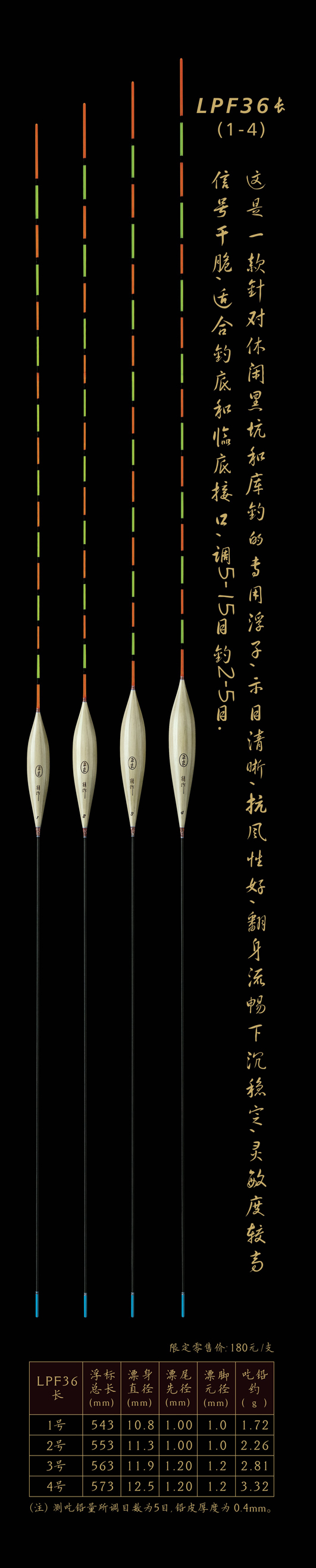 LPF36長:這是一款針對(duì)休閑黑坑和庫釣的專用浮子,示目清晰,抗風(fēng)性好,翻身流暢下沉穩(wěn)定,靈敏度較高信號(hào)干脆,適合釣底和臨底接口,調(diào)5—15目,釣2—5目.